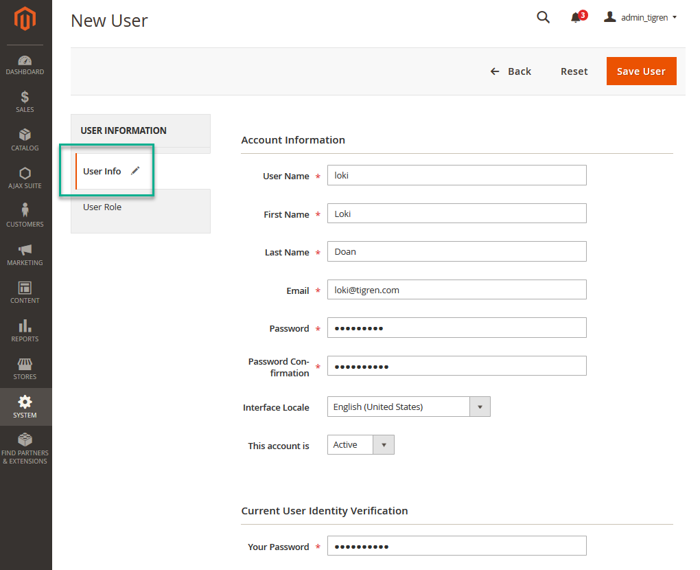 After that, you have to configure the User Info by providing all Account Information (including User Name, First Name, Last name, Email, Password, Interface Locale) of the new admin user, activating this new account and creating a password for Current User Identity Verification.