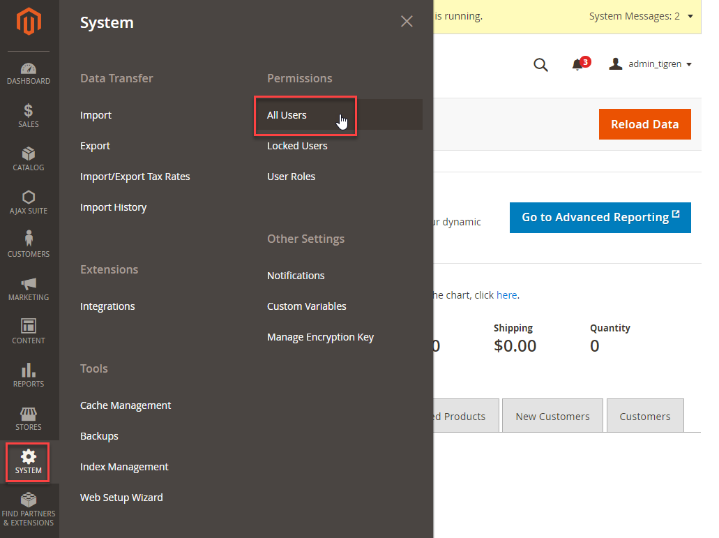 To begin with, you must go to your admin panel, navigate to SYSTEM, and choose All Users under Permissions (Admin Panel => SYSTEM => All Users) as the following: